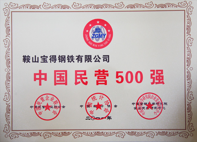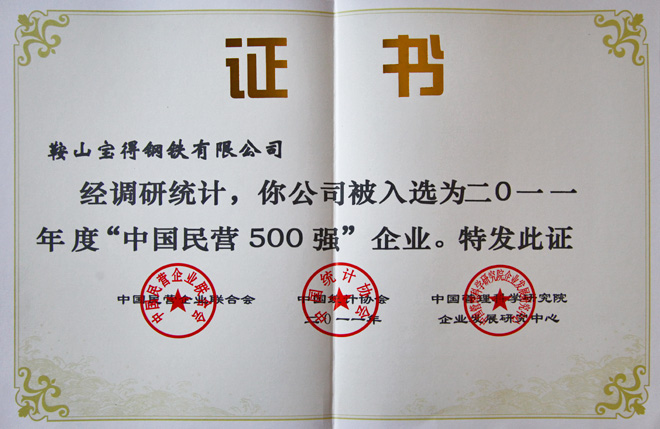 公司榮獲2011中國民營經(jīng)濟(jì)500強(qiáng),排名第391位。遼寧省共12家企業(yè)入選。